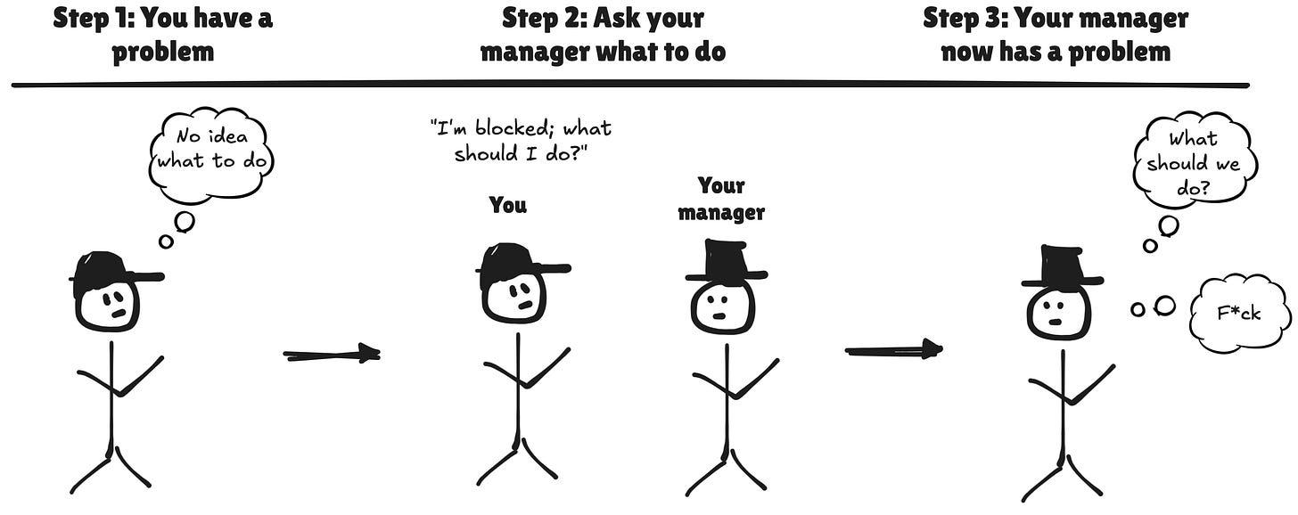 To be clear, this is a very natural reaction to running into friction, and I’ve been there plenty of times myself. But these moments are the ideal opportunities to practice agency, and learning to unblock yourself will pay massive dividends. You’ll be able to move much faster, and your manager will love you for not trying to pass the monkey to them every single time something comes up.