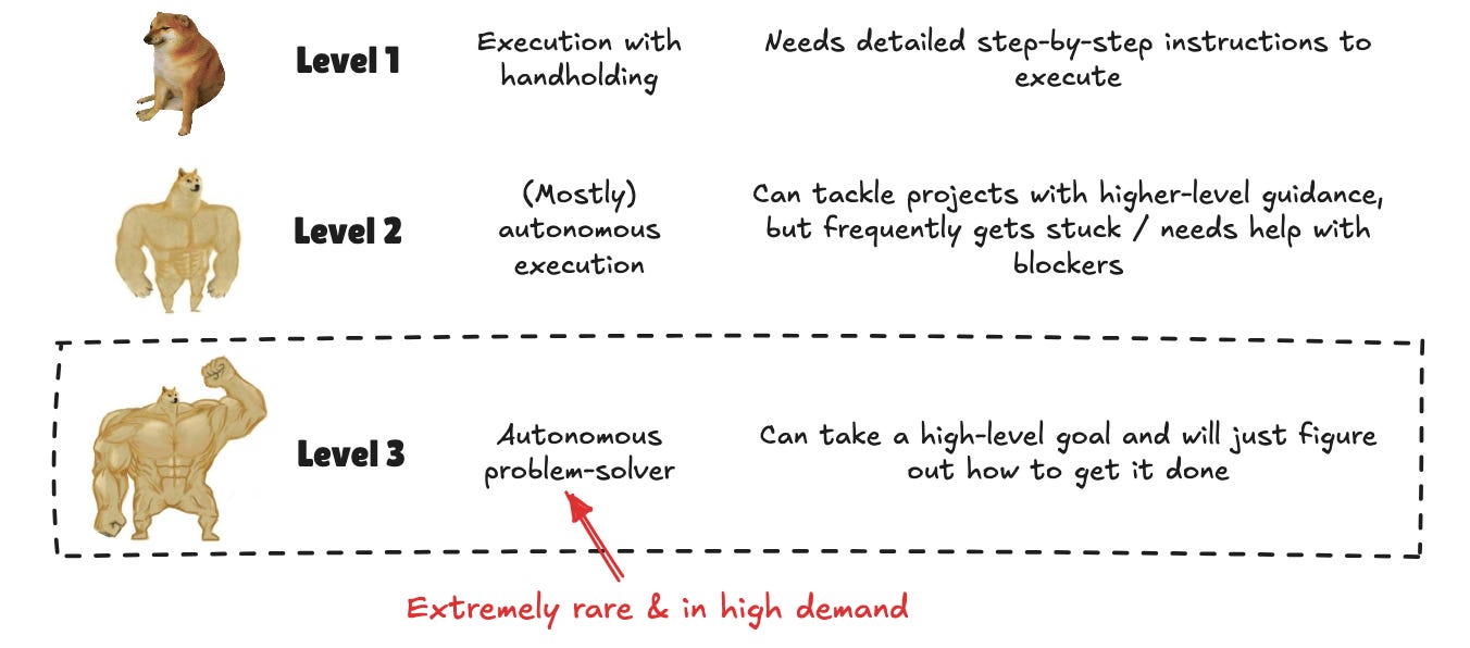 🛠️ For the IC, it means having the freedom to solve problems creatively instead of feeling micromanaged and just executing orders. And you’ll be much less likely to get replaced by AI: AI can already execute straightforward tasks with detailed instructions well, but is (so far) unable to take a high-level goal and run with it