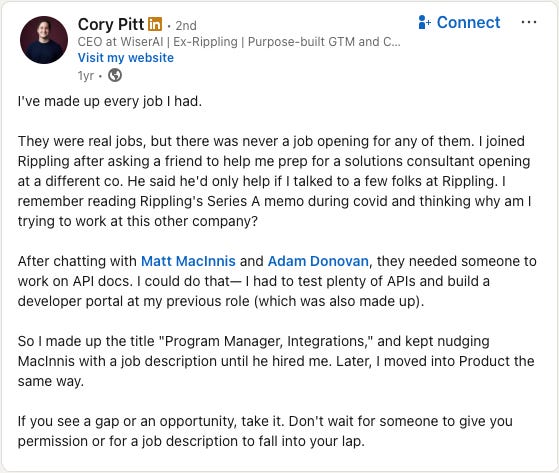 It might not always work out, but if it does, you have the opportunity to write your own job description, and you’ll be the first (and potentially only) applicant.