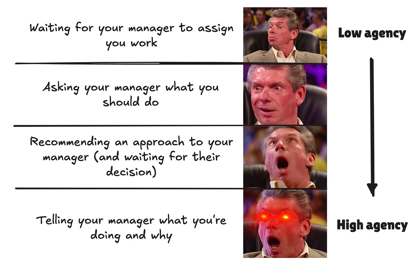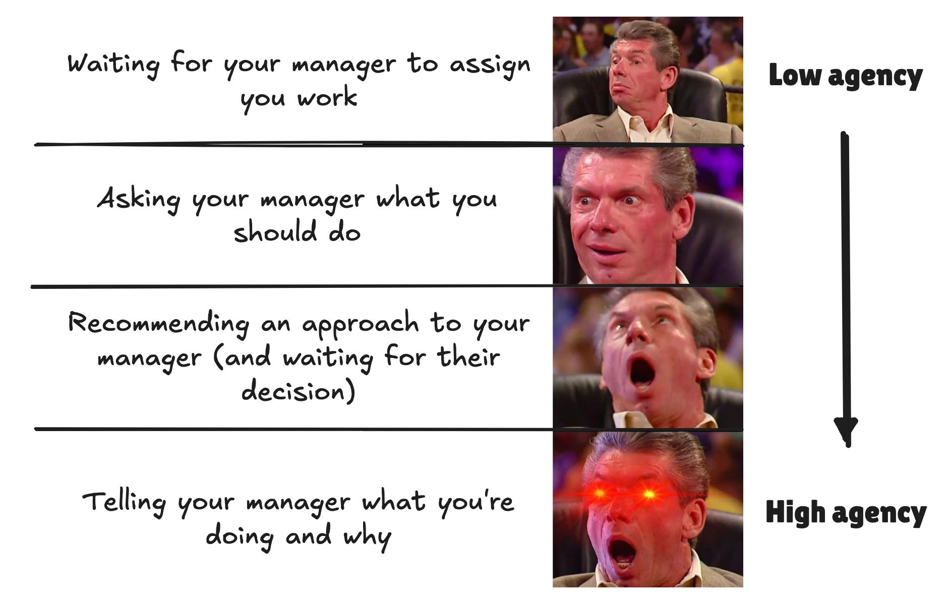 Of course, not every manager actually wants this in practice. If your manager is too insecure to give their direct reports freedom to operate like this, there is only so much you can do (agency or no agency); at least while you’re staying on that team. The high-agency move, in that case, would be to find a team where you’ll get more autonomy